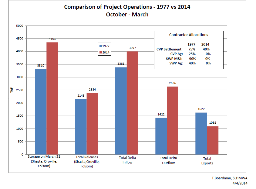 As of now, there is one million acre-feet more storage in Northern California’s CVP and State Water Project reservoirs this year than there was in critically dry 1977, a drought year in which all south-of-Delta CVP and SWP contractors, including Friant, received enough water to avoid disaster.
